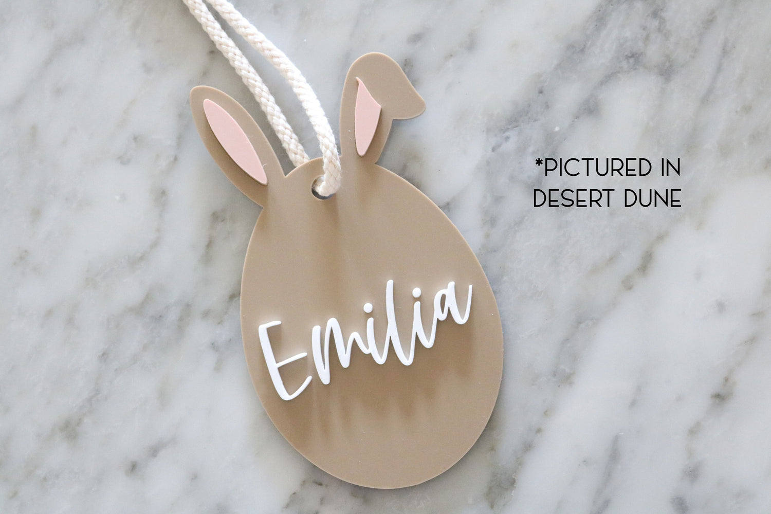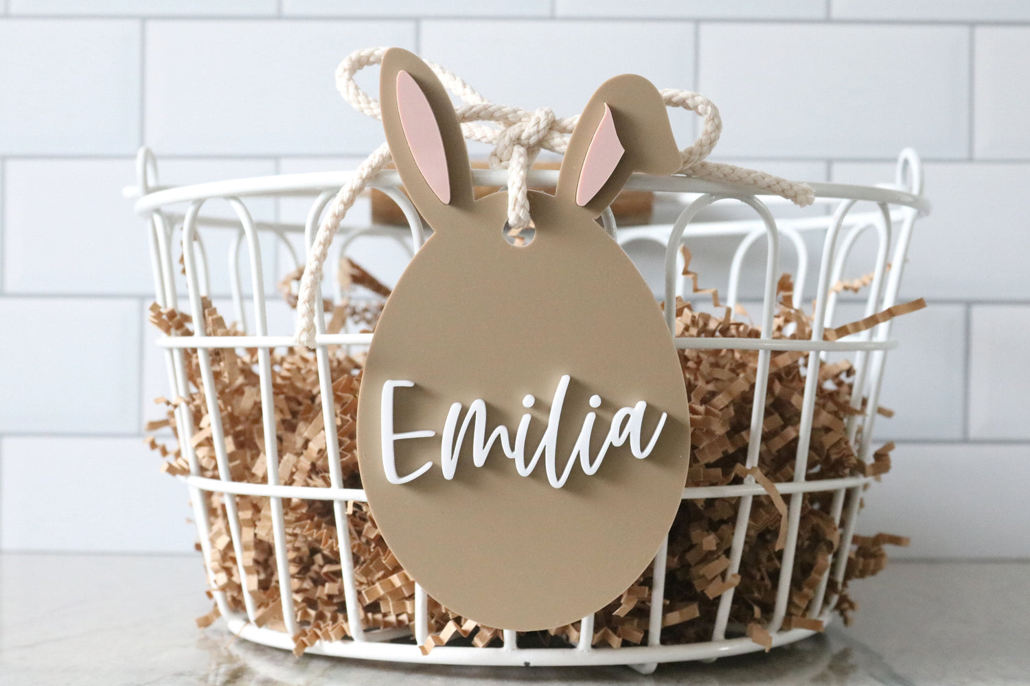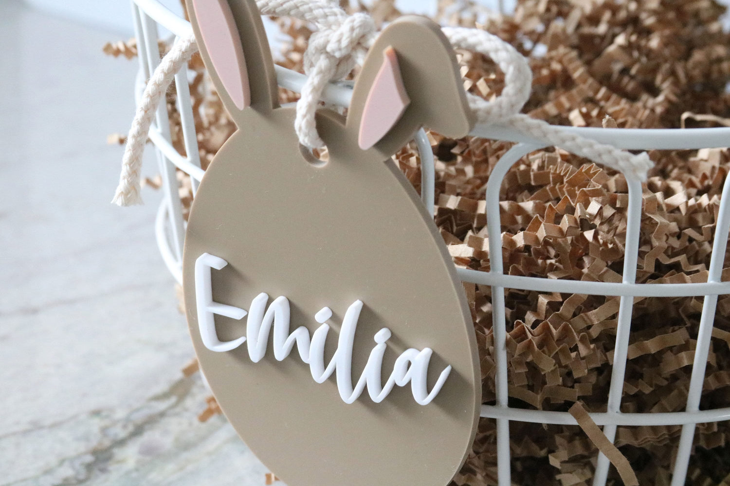 custom bunny easter basket acrylic name tag | easter basket | name tag | place card | first easter | kids basket | bunny ears | bag tag