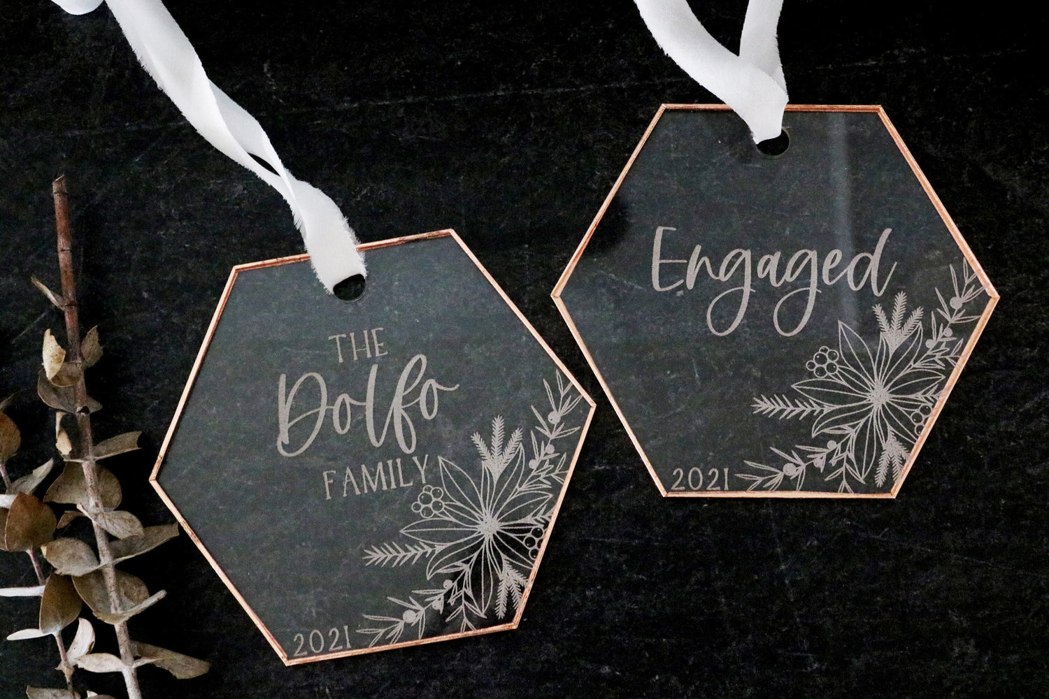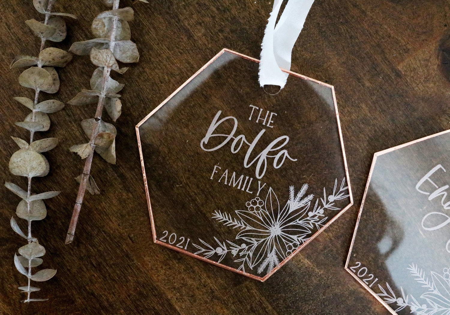 + One laser engraved clear acrylic ornament (approx. 4"x4.5" hexagon)