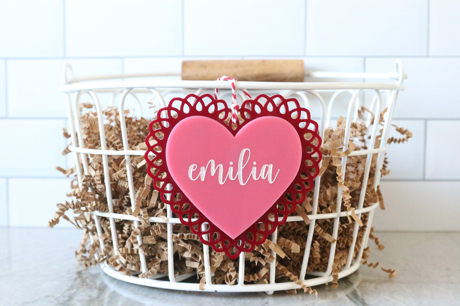 + Double layered acrylic. Choose your heart color (pink or dark red). Name will be engraved in white.