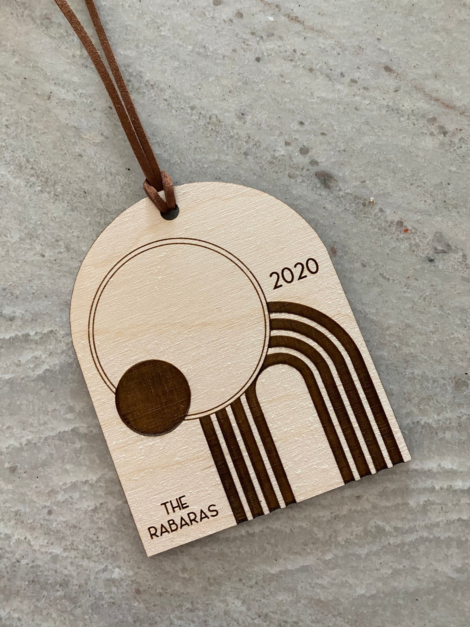 + One laser engraved wood ornament with brown suede ribbon