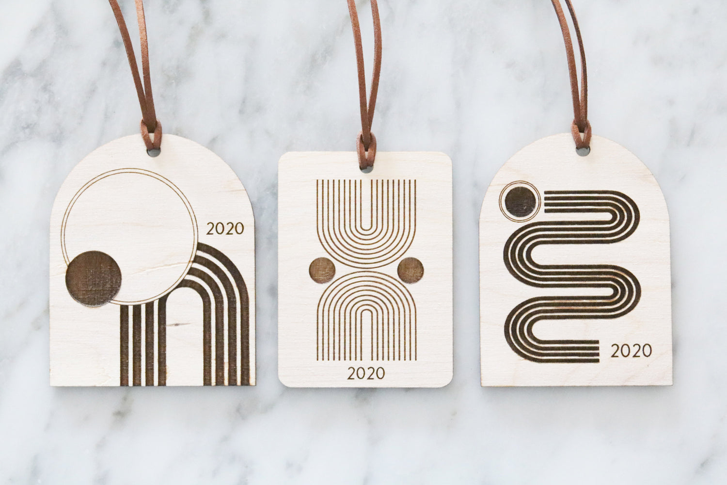 + One laser engraved wood ornament with brown suede ribbon